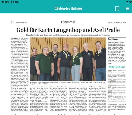 Starke Leistungen zeigte auch das Ehepaar Harry und Karin Langenhop aus Hollige. Beide erreichten in ihren Altersklassen den 4. Platz, Karin Langenhop fehlten zwei Ringe zur Bronzemedaille, Ehemann Harry gar nur ein Ring. Beide trainieren in der Esseler Sportgruppe mit und wurden bei der Siegerehrung mit einer Urkunde und dem Meisterschaftsabzeichen ausgezeichnet.
